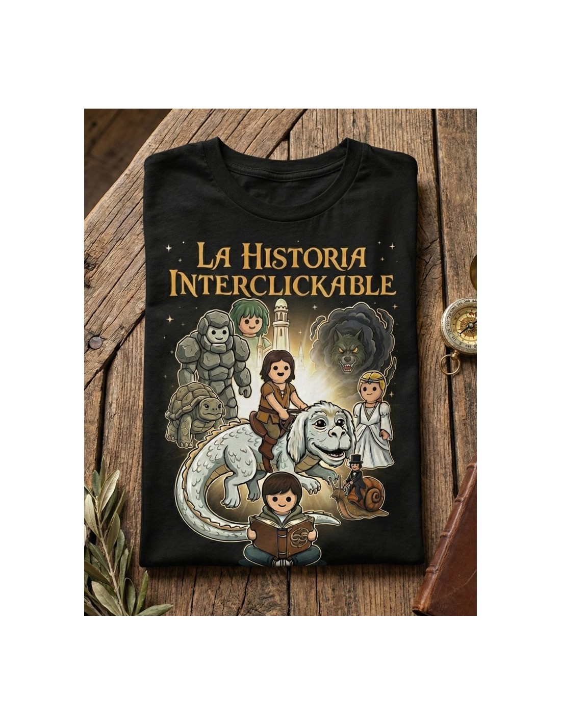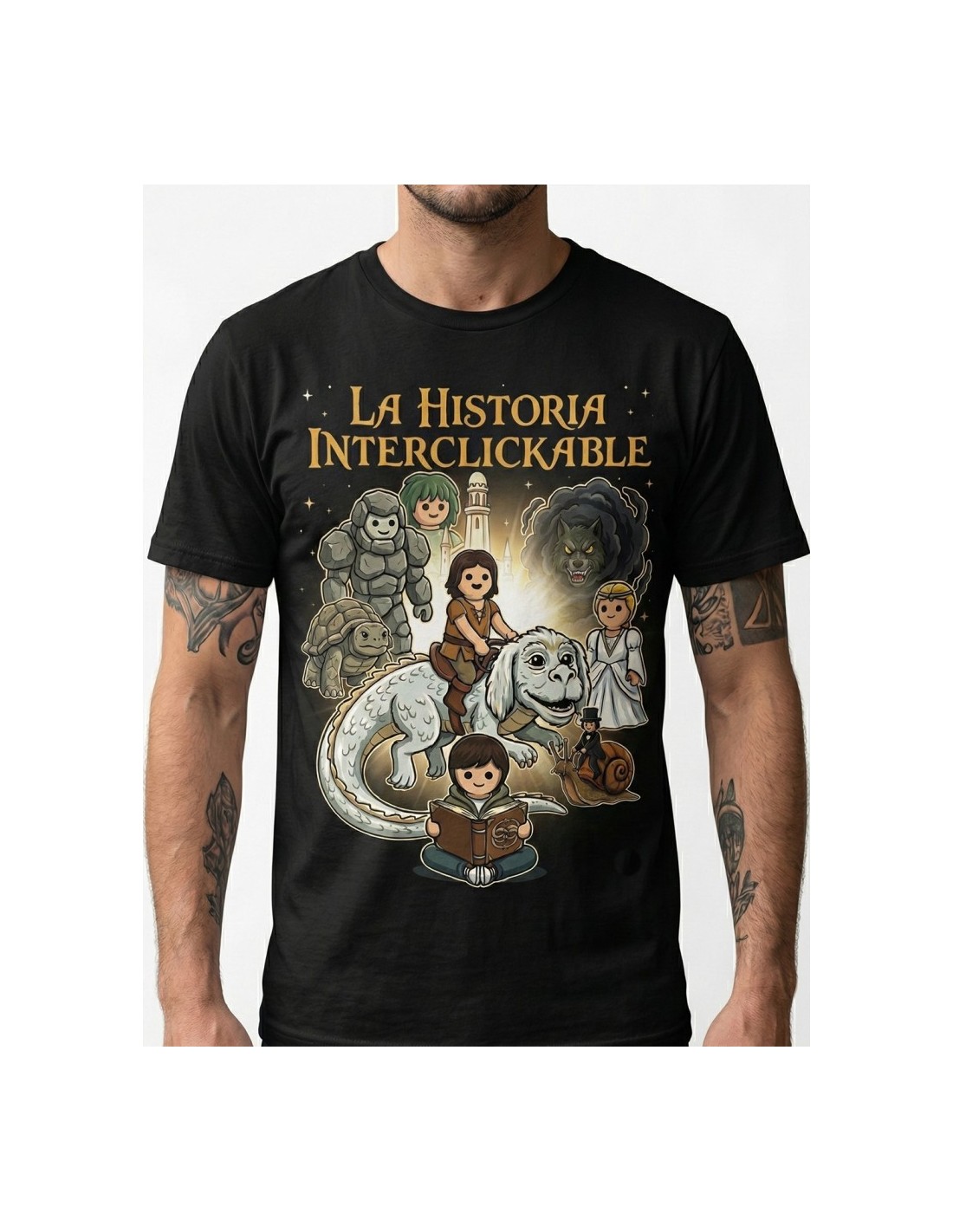 Sumérgete en el universo de La historia interminable con nuestra camiseta exclusiva ‘La Historia Interclickable’. Este diseño original transforma a los personajes más emblemáticos de la película en divertidos Playmobil, creando una prenda única para fans de los 80, el cine fantástico y la nostalgia noventera.